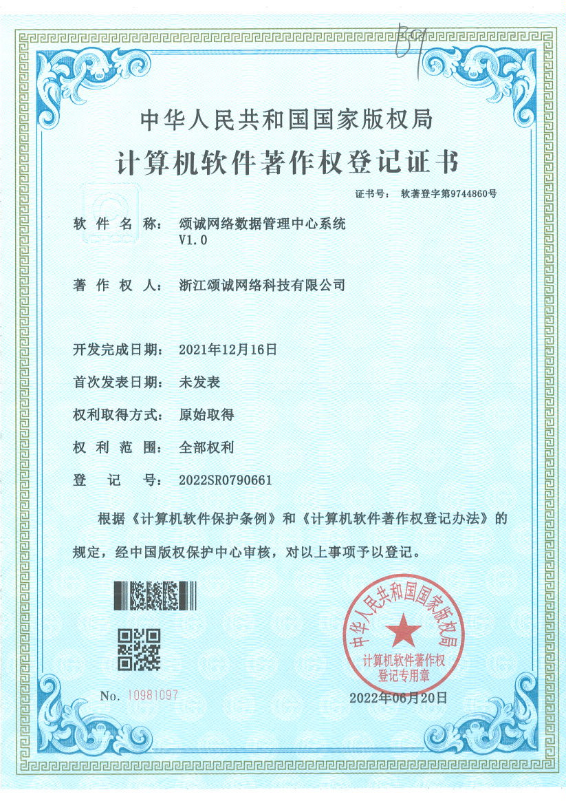 根據(jù)國家《中華人民共和國著作權(quán)法》、《計(jì)算機(jī)軟件保護(hù)條例》和《計(jì)算機(jī)軟件著作權(quán)登記辦法》的相關(guān)規(guī)定,浙江頌誠網(wǎng)絡(luò)科技有限公司自用的頌誠網(wǎng)絡(luò)數(shù)據(jù)管理中心通過了相關(guān)著作權(quán)內(nèi)容審核,取得了相關(guān)的全部權(quán)利,于近日下發(fā)了登記證書。